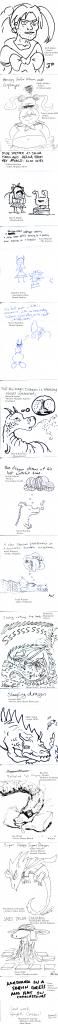Anyways, I ran two games of Picture Telephone at ECC with the artists in the dealer's and artist's halls. I wish I could have included all of the artists but it took a lot longer then I thought, and some were too busy or weren't able to play for some reason or another anyways. By the end I think 25 people contributed, many of whom were professional artists, some of whom were professionals in some other area of comics such as writers or editors. I had one person contribute who was just a con-goer who happened to come up to the right booth at the right time. I was able to figure out who everyone was except two people (the random con-goer and the girl running the fake machine of death) who I've contacted via email, so I hope to add their information in once they contact me. (Edit: Machine of Death girl has been identified!)